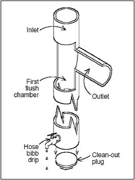 DIY First Flush\Filter Diverter – Our First-Flush Diverter retains the initial runoff from a roof in a section of 3 foot 2” PVC pipe that is capped by a screw fitting.