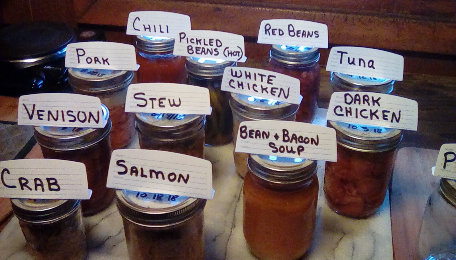 Meats, fruits, and vegetables are stored by steam and pressure canning