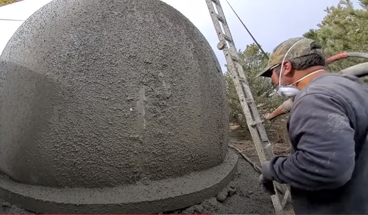 Step 3 …. ShotCrete Styrofoam beads, newsprint, and Portland cement mixture to build the Dome