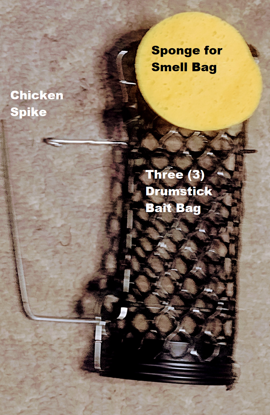 Just place a chicken drumstick on the chicken Spike. If the crab is around, you will catch them in no time. Three (3) CrabEagles Traps can be stored in a six-gal bucket with a lid