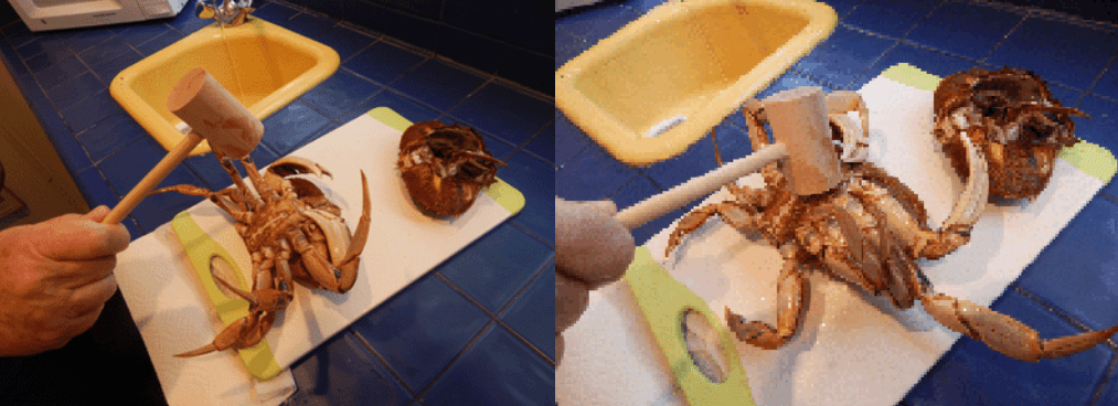 Using a crab mallet and shaking the crab will cut your crab-picking time to minutes rather than hours. The crab mallet is used to humanely kill the crabs by turning them over onto their back and striking at their abdominal flap, humanly killing them before cleaning and cooking them.