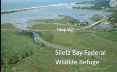 Siletz Bay National Wildlife Refuge is located just south of Lincoln City along US Highway 101. Look for the refuge sign and turn east onto Millport Slough Lane into the refuge parking lot. The GPS coordinates are 44°53’42.87”N 124°00’34.14”W.