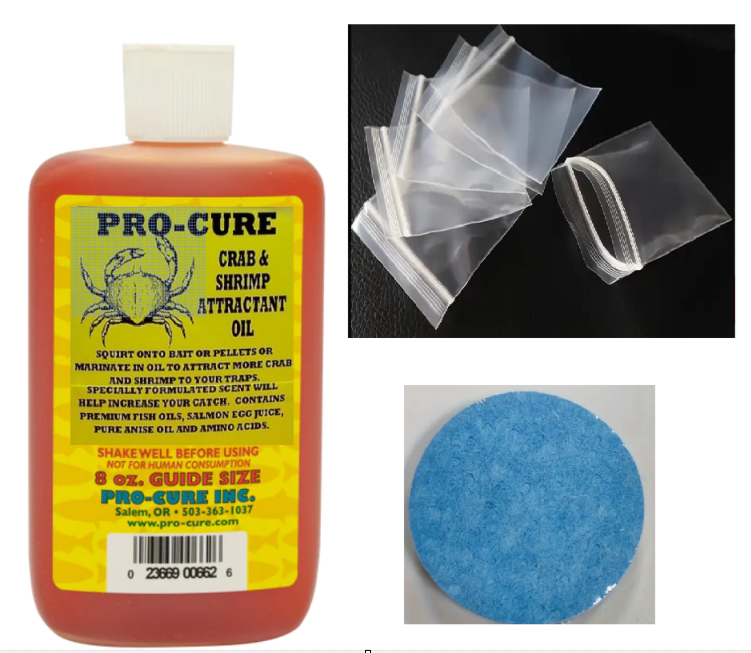 Twelves (12) 3 X 3 plastic bags Twelves (12) 3 inch Spongs Eight (8) oz of Procure Crab Attractant
